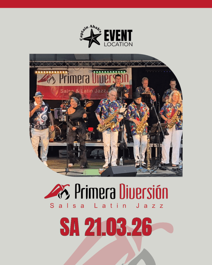 Die Big Band PRIMERA DIVERSIÓN bringt mitreißende Salsa-Rhythmen, Latin-Grooves und Jazz-Vibes direkt auf die Bühne im Captain Ahab’s Saal!